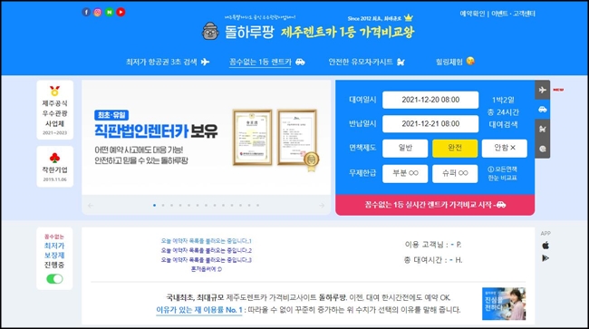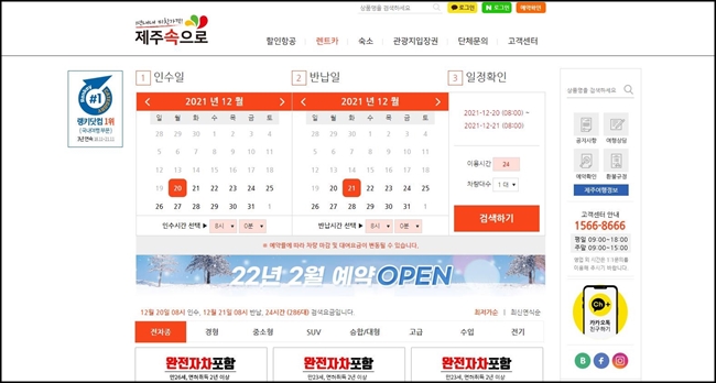 돌하루팡 홈페이지에서 또한 렌트카 최저가 가격비교가 가능합니다. 대여일시, 반납일시, 면책제도를 선택하시면 되며 실시간 렌트카 가격비교가 가능합니다. 차량만 선택하시면 쉽게 예약이 완료됩니다.