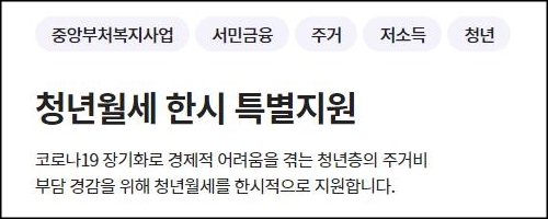 코로나19 장기화로 경제적 어려움을 겪는 청년층의 주거비 부담 경감을 위해 청년월세를 한시적으로 지원