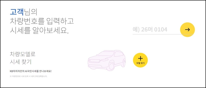 마지막으로 소개해드릴 곳은 'KB차차차' 입니다. KB차차차 또한 차량번호를 입력하여 내차 시세조회가 가능하며 원하는 차량 모델을 입력하여 간략한 중고차시세 확인도 가능합니다.